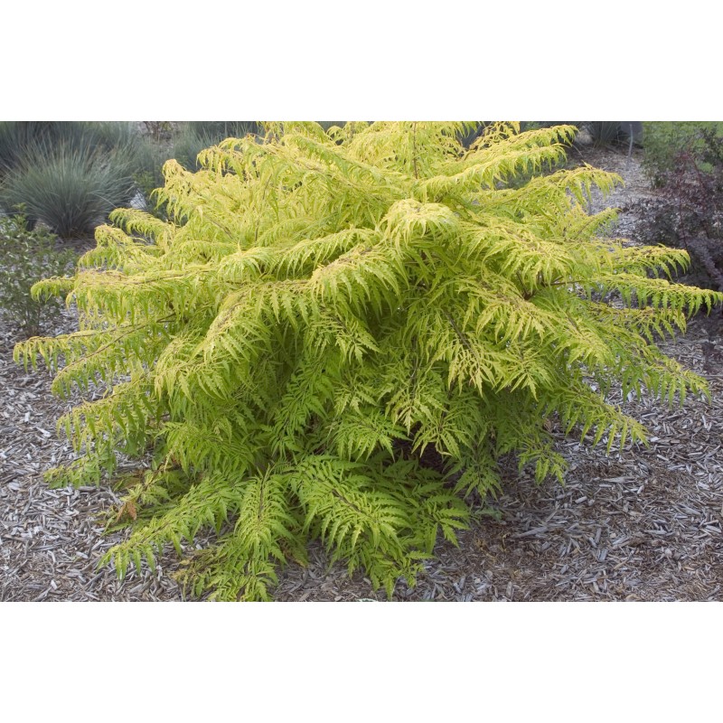 (Rhus typhia Tiger Eyes®) Vacker rönnsumak med guldgula, djupt flikiga blad och purpurrosa bladställningar. Nytillväxten är friskt grön men övergår snabbt i gult. Dramatisk höstfärg i orange och intensivt scharlakansrött. Klarar alla jordtyper men vill stå soligt och väldränerat. Höjd och bredd ca 1,8 m. Lev. i 3,5 L kruka. Zon 1-3. PRIS/ST (2024)