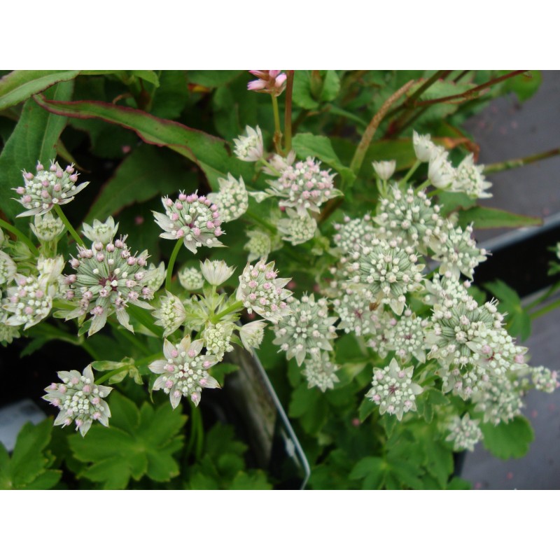 (Astrantia major 'Star of Billion') Trivs bäst i väldränerad och fuktighetshållande jord. Bladverket är handflikigt och mörkt grönt. Blommar med vita blommor med gröna markeringar i juni-sept. Blommorna är utmärkta till snitt och torkning. Lättodlad sort. Höjd 75 cm. SOL-HSK. PRIS/ST.