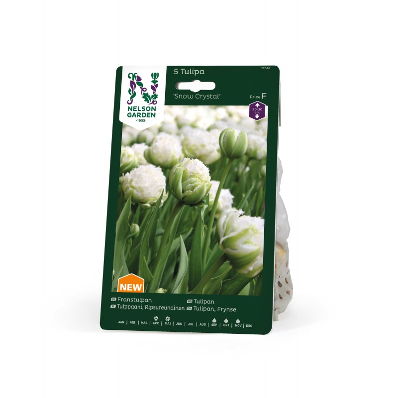 Spektakulär dubbel franstulpan i vitare vitt med tät blomma som låter tankarna vandra till glittrande snöbollar och gnistrande kristaller. Underbar i rabatt såväl som bukett.